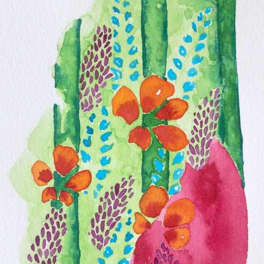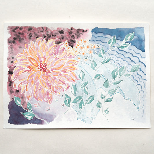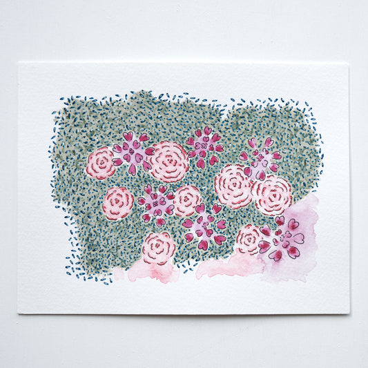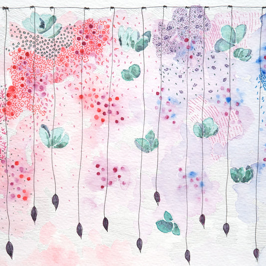 Each unique artwork is painted with great detail and a light texture of watercolour and gouache-soaked paintbrush strokes. Flow is created in detailed, repeated mark-making in the mapping of the piece. Colours are shaped by the luscious flora, expansive mountains and vast ocean of the west coast and Kootenay regions.
